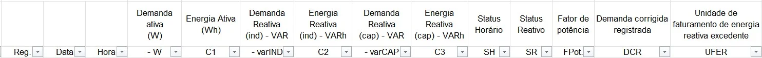 - C1 – Energia ativa medida no intervalo (Wh). Divide-se por 1000 para kWh.